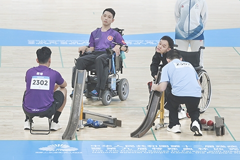 ◎ 十二月十日,全國第十二屆殘疾人運動會暨第九屆特殊奧林匹克運動會硬地滾球個人賽循環賽在香港啟德體育園啟德體藝館舉行。圖為香港隊選手謝德樺(左二)在男子個人BC3循環賽中以三比二戰勝廣東隊選手東列園。(中新社記者 李志華 攝)