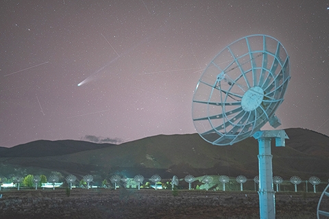 ◎ 這是十月二十日在四川省稻城縣子午工程二期圓環陣太陽射電成像望遠鏡前拍攝的萊蒙彗星。 今年以來地球上可觀測的最亮彗星近期進入公眾視野,它就是公轉周期一千三百多年的C/2025 A6(Lemmon)彗星(簡稱「萊蒙彗星」)。 天文科普專家表示,這顆彗星會在十月廿一日過近地點,十一月八日過近日點,這…