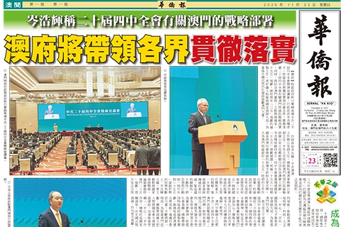 【專訪】特區政府昨日舉辦兩場中共二十屆四中全會精神宣講會,行政長官岑浩輝表示,特區政府將團結帶領社會各界,貫徹落實二十屆四中全會有關澳門特區的戰略部署,同時,將結合澳門實際,主動對接國家「十五五」規劃,做好明年「三五」規劃的編製工作,更好融入和服務國家發展大局,為推進中國式現代化建設貢獻澳門力量。…