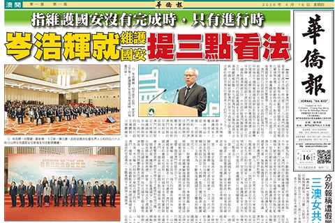 【專訪】行政長官兼澳門特別行政區維護國家安全委員會主席岑浩輝、昨出席二0二六年澳門特別行政區全民國家安全教育系列活動開幕式暨徵文和短視頻比賽頒獎典禮。他致辭時表示,和平並不必然、安定來之不易。維護國家安全沒有完成時,只有進行時,維護國家安全任務至關重要,並提出三點看法。 澳門特別行政區政府與中央人…