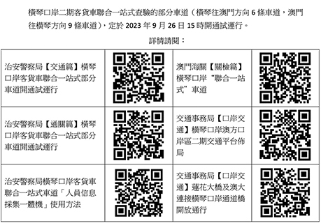 【特訊】橫琴口岸二期客貨車聯合一站式查驗的部份車道(橫琴往澳門方向六條車道,澳門往橫琴方向九條車道),將於二0二三年九月二十六日十五時開通試運行。