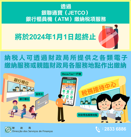 【特訊】財政局近年積極推動電子政務,為有效分配行政資源,經檢視和整合各種納稅方式之後,二0二四年一月一日起終止透過銀聯通寶(JETCO)銀行櫃員機(ATM)繳納稅項的服務。