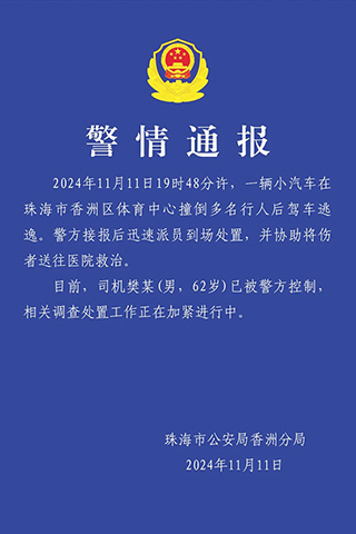 多輛一二0救護車到現場救治及運送傷者,多輛警車到達現場協助。珠海警方于二十一時二十二分發佈警情通報指:二零二四年十一月十一日十九時四十八分許,一輛小汽車在珠海市香洲區體育中心撞到多名行人後駕車逃逸。警方接報後迅速派員到場處置,並協助將傷患送往醫院救治。