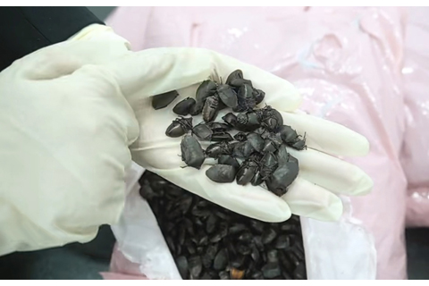 拱北海關稱,本月三日上午十一時許,澳門男子梁某乘坐電動輪椅經拱北口岸旅檢大廳海關「綠色通道」進境。現場關員發現其輪椅後方掛著的兩個黑色布袋存在異常,遂將其截查。隨後,關員從布袋中發現六包塑料袋裝物品,裡面裝有大量通體呈黑褐色、散發濃烈腥味的乾製昆蟲,重五點七公斤。當事人供述以上物品為替他人攜帶進境並收取「帶工費」。