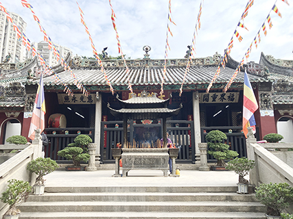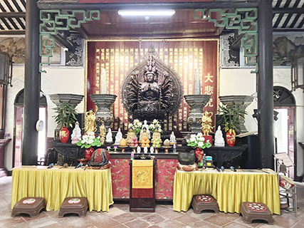 進門,巨大的古董香爐橫亙門庭,終日香烟繚繞;入內,三進三殿。大雄寳殿法雨彌天,供奉佛祖釋迦牟尼等三寳佛,中殿是彌勒佛,而最受居民關切,最信奉的是內殿大蓮座上,樟木雕製的千手觀音,大多數人都是求她庇祐而來,殿旁站立猙眉凸眼,膀大腰圓的十八羅漢,威風八面,懾人心魄。