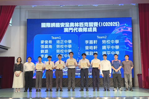 昨日頒奬禮向四項競賽中具突出表現的獲獎學生頒發奬項。其中,第一届國際網路安全奧林匹克競賽(ICO)預定於今年六月於新加坡舉行。張鎮南、劉源、李嘉軒(勞校中學),麥俊希、李彥一(培正中學),曾皓軒、葉啟竣(鏡平中學)成功通過綫上的國際選拔賽入選國際網絡安全奧林匹克競賽ICO2025澳門區代表隊,將於本年六月份到新加坡作賽。