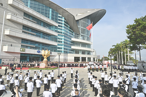 上午八時,莊嚴的國歌奏響,國旗與區旗冉冉升起,現場嘉賓行注目禮,全場齊聲高唱國歌。伴著國歌聲,兩面旗幟升至旗桿頂點,隨風飄揚。