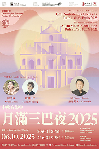 「月滿三巴夜2025」中秋音樂會作為「第五屆粵港澳大灣區文化藝術節」聯動項目,將由澳門中樂團駐團指揮廖元鈺執棒,帶領中樂團奏響耳熟能詳的節日歌曲,包括《彩雲追月》及《花好月圓》等,以及富有澳門特色的《亞婆井》,為人月兩團圓的中秋佳節增添節日歡樂。澳門歌手陳慧敏及歐陽日華亦將登場,演繹《紅豆》《月亮代表我的心》等知名流行歌曲。觀眾可在大三巴牌坊前欣賞傳統與現代交融的曲目編排,感受澳門的文化魅力。