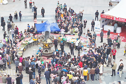 ◎ 十月三日,一口直徑二點一米、高二點八米、重一點二噸的特大湟中暖鍋亮相青海省西寧市中心廣場,供上千民眾現場免費品嚐。特大暖鍋由七十二名銀銅器工匠耗時七十多天共同打造,外形運用國家級非物質文化遺產代表性項目「湟中銀銅器製作暨鎏金技藝」,環壁鑲嵌昆侖玉等多種寶石,浮雕吉祥八寶、山河錦綉等圖案,暖鍋總容積約二點二立方米,內分四個烹調空間。圖為民眾等候美食出鍋。(無人機照片)(中新社記者 馬銘言 攝)