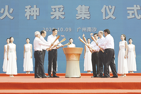 熊熊燃燒的全運聖火被引入四盞火種燈,十五運會廣東賽區執委會主任,廣東省委常委、統戰部部長王曦,香港賽區籌委會主席、香港特別行政區政務司司長陳國基,澳門賽區組委會主席、澳門特別行政區社會文化司司長柯嵐,殘特奧會廣東賽區執委會主任、廣東省副省長李運上台受領,共同展示火種燈,火種將分別奔赴廣州、深圳、香港、澳門四個城市,在十一月舉行火炬傳遞活動。