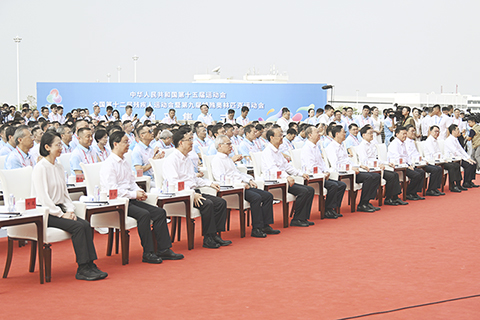 儀式上,火種護衛隊將「源火」盒安放至「源火」台,採火少女在「源火」台引燃手中的採火棒,中共中央政治局委員、廣東省委書記黃坤明,十五運會和殘特奧會組委會主任、國家體育總局局長高志丹,殘特奧會組委會執行主任、中國殘聯理事長周長奎,十五運會和殘特奧會組委會執行主任、香港特別行政區行政長官李家超,十五運會和殘特奧會組委會執行主任、澳門特別行政區行政長官岑浩輝,十五運會和殘特奧會組委會執行主任、廣東省委副書記、省政府黨組書記、深圳市委書記孟凡利共同上台高舉採火棒,點燃十五運會和殘特奧會火種盤,寓意粵港澳三地攜手共進、同心築夢。