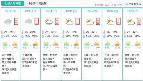 今日多雲間有驟雨 2025-10-12 03:30:00 【特訊】地球物理氣象局消息:預測今日大致多雲。間中有驟雨。早上可能有雷暴。吹三至四級東至東南風。氣溫約為攝氏廿五至廿九度。相對濕度介乎百分之七十五至九十五之間。預測最高紫外線指數約為五,級別屬於中等。◇