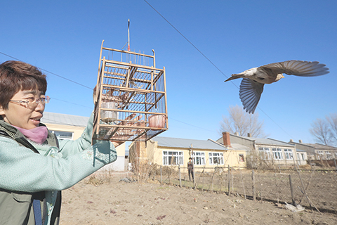 ◎ 哈爾濱野保志願者團隊志願者管紹賢在呼蘭區放飛被捕鳥類(二零一九年十一月二日攝)。