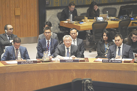 ◎ 中國常駐聯合國代表傅聰十月二十三日在聯合國安理會中東問題公開辯論會上發言,強調必須實現加沙持久停火,盡快緩解加沙人道災難,妥善推進加沙戰後安排,重振「兩國方案」政治前景。圖為當日,在位於紐約的聯合國總部,中國常駐聯合國代表傅聰(前中)在聯合國安理會中東問題公開辯論會上發言。(新華社記者 張鳳國 攝)