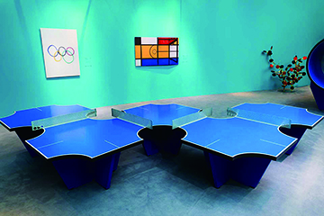《動競藝境》以藝術語言回應競技精神。展覽由三個核心展區構成:「夢幻球場」 呈現佩博斯專為新濠天地打造的裝置作品《區域》,以網球場為靈感,通過草皮鋪設與空間錯置營造出沉浸式場景,讓觀眾仿如置身於顛倒的網球世界。「身體神話」 巧妙運用視覺錯覺的原理,重塑運球中的維納斯,並將籃球元素解構重組,創作出古希臘英雄與神明的頭像雕塑。透過這些在當代審美下的偶像符號,佩博斯除了塑造出新的美學形象,同時亦以矛盾與反諷的修辭,幽默回應這種當代美學。「乒乓花園」則打破既有的競技規則,將球桌扭曲、摺疊、延展,創造出充滿遊戲感的互動場景。其中,裝置作品《拼圖》由三張乒乓球桌拼接,可容納七人同場競技,鼓勵觀眾以互動和遊戲的方式展開交流與思考。