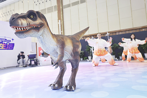 ◎ 十月二十九日,「智享未來──保姆機器人大會」成都智慧康養機器人展演在成都舉行。此次展演將一百七十五款智慧康養機器人產品植入到生活居家、娛樂健身等實景中,全面展現智慧康養機器人帶來的未來生活新圖景。圖為展出的仿生恐龍機器人。(中新社記者 王磊 攝)