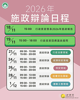 至於各領域施政方針的立法會辯論會議,日程分別是:十一月廿一日辯論行政法務領域、二十四日辯論經濟財政領域、廿六日辯論保安領域、廿八日辯論社會文化領域,以及十二月一日辯論運輸工務領域的施政方針。◇