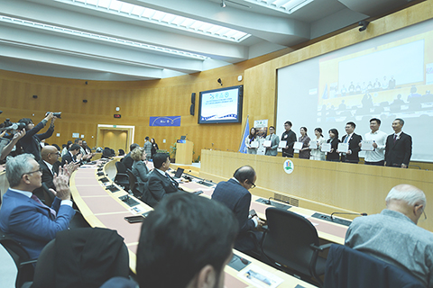 ◎ 全球人居環境論壇十一月五日公佈第二十屆「新可持續城市與人居環境獎」(簡稱「新颯颯獎」)獲獎名單,多個中國項目獲得這一全球權威獎項。圖為當日在瑞士日內瓦世界氣象組織總部拍攝的第二十屆「新可持續城市與人居環境獎」頒獎現場。(新華社記者 連漪 攝)