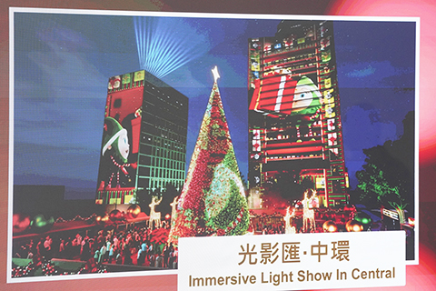 ◎ 十一月七日,香港旅遊發展局年度盛事「香港繽紛冬日巡禮」在交易廣場舉行啟動儀式。旅發局與置地公司合作,將中環皇后像廣場花園打造成「聖誕天地」,二十米高戶外聖誕樹亦將載譽歸來。同時,遮打道將會亮起浪漫的「星光長廊」。旅發局更會邀請八棟中環地標合作,呈獻「光影匯·中環」,點亮中環。「香港繽紛冬日巡禮」將於二零二五年十一月十四日至二零二六年一月四日舉行。圖為「光影匯.中環」效果圖。(香港中通社 陳奕啟 攝)
