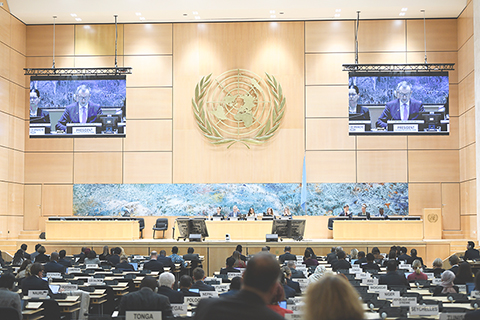◎ 圖為十一月七日在瑞士日內瓦萬國宮拍攝的聯合國人權理事會普遍定期審議工作組第五十屆會議現場。當日,聯合國人權理事會原定對美國進行第四輪國別人權審議,但美國代表拒絕出席相關會議,導致本輪審議未能正常進行。人權理事會當天通過一項決定,敦促美國恢復與國別人權審議機制合作。(新華社記者 連漪 攝)
