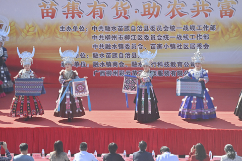 ◎ 十一月十五日,在融水縣融水鎮苗家小鎮社區,演員展示苗繡和苗錦。當日,廣西融水苗族自治縣融水鎮苗家小鎮社區舉辦第二屆「苗集有貨.助農共富」助農大集市,集市設立特色農產品區、手工藝品區、民族特色美食區、非遺技藝展示區等,對各鄉鎮的農特產品和非遺文化進行展示、展銷,促進鄉村振興產業發展。(新華社記者 黃孝邦 攝)