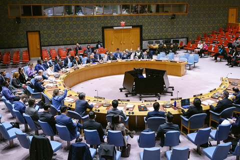◎ 中國常駐聯合國副代表耿爽十一月十四日在聯合國安理會表決涉也門制裁機制授權延期決議草案後作解釋性發言,對有關國家試圖推動紅海和附近水域「海上登臨檢查」表達保留態度。聯合國安理會十四日表決由英國起草的涉也門制裁機制授權延期的決議草案。該草案以十三票贊成、0票反對、二票棄權的結果獲得通過。中國和俄羅斯投了棄權票。圖為十四日在位於紐約的聯合國總部拍攝的安理會投票表決現場。(新華社發 聯合國供圖/洛伊.費利佩 攝)
