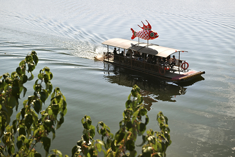 ◎ 十一月十六日,安徽黃山,遊客乘坐魚燈遊船在新安江畔遊覽。古老而悠閑的「乘船慢遊」受到遊客喜愛。(中新社記者 韓蘇原 攝)