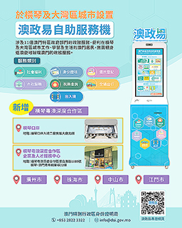 「澳政易」自助服務機提供澳門特區政府有關社會福利、身份證明、稅務查詢、市政服務、選民登記、交通出行及出入境共七個類別,涉及十一個部門共三十七項澳門居民常用的政務服務,便利在區內工作及生活的澳門居民,無需回澳便可辦理所需服務,助力營造澳琴趨同的宜居環境。「澳政易」自助服務機設於橫琴口岸入境二層集散大廳北側及橫琴粵澳深度合作區企業及人才服務中心(地址:粵澳深度合作區環島東路一八八九號橫琴.澳門青年創業谷二十二棟)。此外,於今年六月,上述自助服務機已設於廣州市、珠海市、中山市及江門市共四個大灣區城市。有關「澳政易」自助服務機詳情,請瀏覽「澳政易」專題網頁:https://www.dsi.gov.mo/mo-eservice/。