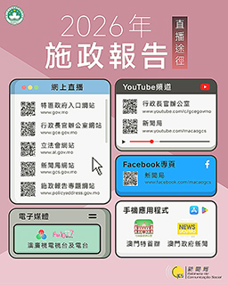 此外,新聞局屆時也在Facebook葡文專頁(www.facebook.com/macaogcspt)及英文專頁(www.facebook.com/macaogcsen),發佈2026年施政報告的資訊。