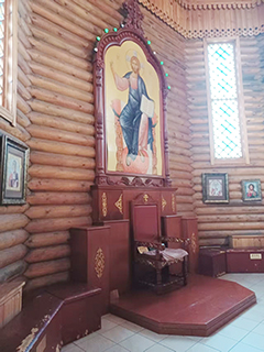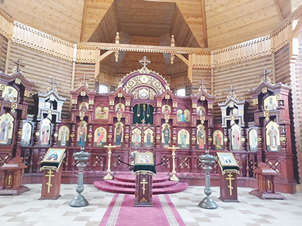 艷陽天的下午穿過花徑,來到聖・尼古拉大教堂(俄羅斯東正教),整座教堂採用木構架井幹式建成,據導遊介紹該教堂是屬於俄羅斯哥德式的八面體木結構。整座建築物是由整齊的原木水準疊砌成的牆體,牆體交叉處與原木互相咬合。這種井幹式圓木結構建築,特出了八面尖角的屋頂和周圍的北方自然景色十分和諧,中央大圓頂上矗立鋼製的鍍金大十字架,帳篷頂端的5個洋蔥形穹頂和多變的造型。教堂正門的聖母像和壁畫,是俄國畫家古爾希齊文克所作,顯現出莊嚴肅穆又具富麗堂皇的氣派。