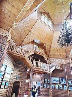 抬頭望去如洋蔥形穹頂如一串串垂落的漿果,由下至上漸次收窄,最終在最高處托舉着金色十字架。沒有磚石的冷硬感覺,整座教堂的穹頂和牆體、廊柱全是由西伯利亞落葉松拼接而成。工匠們將木材剖成弧形構件,以榫卯咬合出穹頂的曲面,那些暴露在外的木節與紋理,恰似教堂天然的年輪。