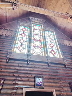 推開厚重的木門,松木的清香混着蜂蠟的甜膩撲面而來。教堂內部沒有一根立柱,卻通過精巧的桁架結構撐起三十米高的空間。陽光透過彩色玻璃窗,在木牆上投下流動的光影,照亮了樑架上留存的俄文施工標記。而在穹頂內側的彩繪,並非顏料塗飾而是工匠用不同紋理的木材拼貼出來的聖經故事,胡桃木的深褐與白蠟木的乳白在光影中形成立體的敘事。