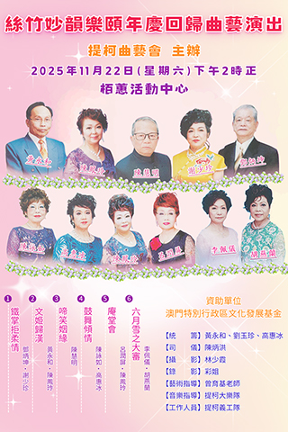 由提柯曲藝會主辦,澳門特別行政區文化發展基金資助的「絲竹妙韻樂頤年慶回歸曲藝演出」,將於2025年11月22日(星期六)下午2時假街總栢蕙活動中心演出。