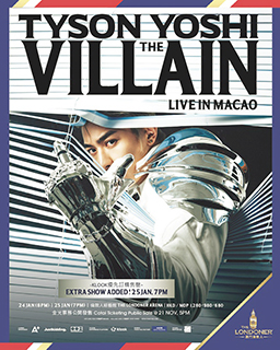 香港人氣歌手Tyson Yoshi首次在澳門舉辦個人演唱會,將於2026年1月24及25日一連兩日登陸澳門倫敦人的倫敦人綜藝館,呈獻《TYSON YOSHI THE VILLAIN LIVE IN MACAO》。門票將於2025年11月21日(星期五)下午5時起在金光票務、澳門售票網及大麥網同步發售。