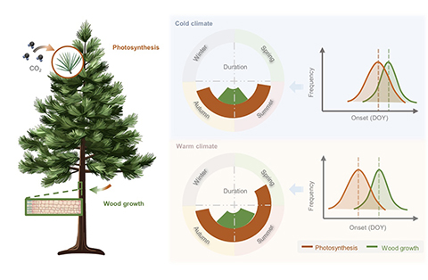李曉霞介紹說,本項研究基於北半球84個樣點、24種針葉樹的形成層活動監測數據,研究團隊對從-4.4℃到18.2℃年均溫度梯度上的木質部物候特徵進行系統分析,通過與遙感反演的光合物候高頻比對研究發現:年均溫度每升高1℃,光合作用啟動日期提前約4天,而木質部生長僅提前2天;在溫暖的溫帶和地中海地區,兩者啟動時間差最大可達62天,幾乎是寒帶和高山地區兩倍,表明光合作用與木質部生長之間的「時間差」隨溫度升高顯著拉大。