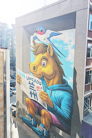 蘭州街頭現巨型3D「銅奔馬」牆繪