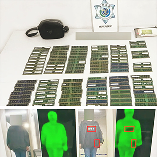 11月25日,關員在關閘口岸出境旅客檢查區發現一名男性澳門居民步態異常,經檢查,發現該男子將65件記憶卡藏在衣物及隨身物品內,試圖將之偷運出境。