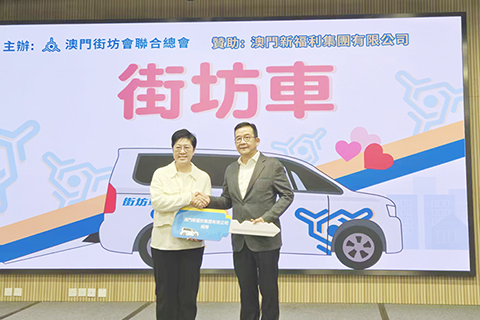「街坊車」捐贈儀式昨日下午三時於街總社區服務大樓舉行,澳門社會工作局復康服務處代處長蘇志群,新福利集團有限公司董事長廖僖芸、董事曾雲強、總經理鄭妙嫻,街總會長吳小麗、理事長陳家良及服務使用者代表等出席。