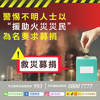 近日,司警局接獲商會代表反映,有自稱來自香港慈善機構的人士前往本澳商店募款,聲稱所籌得款項將用於援助香港火災受災居民。由於鄰近地區已出現藉募捐賑災為名的詐騙案件,司警局提醒公眾必須提高警惕,慎防不法分子進行詐騙。