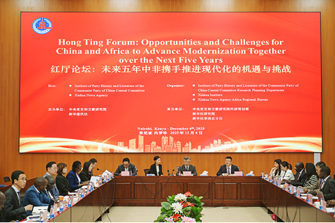 ◎ 由中央黨史和文獻研究院、新華通訊社主辦的「紅廳論壇:未來五年中非攜手推進現代化的機遇與挑戰」十二月四日在肯尼亞首都內羅畢舉行。來自中肯政府、智庫、媒體和企業界六十餘名嘉賓深入交流,圍繞二十國集團領導人峰會成果落實、中非合作和中肯合作,以及未來五年中國發展為非洲和肯尼亞發展提供的新機遇等議題展開討論。圖為當日在肯尼亞首都內羅畢拍攝的「紅廳論壇:未來五年中非攜手推進現代化的機遇與挑戰」現場。(新華社記者 楊光 攝)