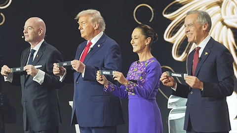 特朗普、墨西哥總統辛鮑姆和加拿大總理卡尼之後一同上台抽籤,各人分別抽出自己所屬國家,美國、墨西哥和加拿大分別位處D組、A組和B組。