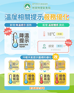 氣象局表示,「降溫提示」主要針對本澳秋冬季的氣候特點,當預測氣溫顯著或大幅顯著下降時,氣象局將提前發出降溫提示,為市民提供更豐富多元和及時的氣象資訊,讓公眾能提前採取適當預防措施,減少顯著降溫天氣對健康造成的影響。