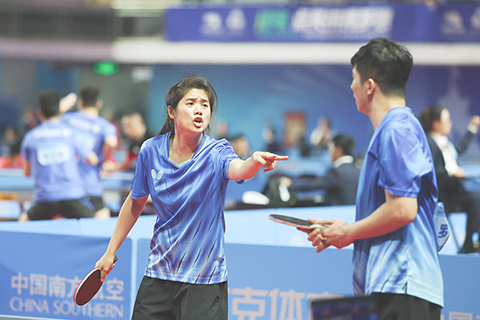 ◎ 十二月九日,全國第十二屆殘疾人運動會暨第九屆特殊奧林匹克運動會乒乓球聽力殘疾組混合雙打項目在廣州落下帷幕。來自廣西的「夫妻檔」組合羅振邦/黃夢萍經過四局激戰,以三比一的比分戰勝擁有奧運冠軍頭銜的強勁對手王聰/王哲,奪得金牌。黃夢萍與羅振邦的緣分始於乒乓球。兩人在訓練中相識,此後相互扶持,於二0一四年相戀,又在二0一九年登記結婚,完成了從球場搭檔到人生伴侶的圓滿約定。搭檔混雙至今,他們已攜手征戰多個重大賽事,合作長達二十年。黃夢萍在賽後通過手語表示:「這枚金牌,是我們送給對方最好的禮物。它告訴所有人,也告訴我們自己,沒有什麼是不可能的。」圖為黃夢萍(左)在比賽中通過手語和羅振邦交流。(中新社記者 陳楚紅 攝)
