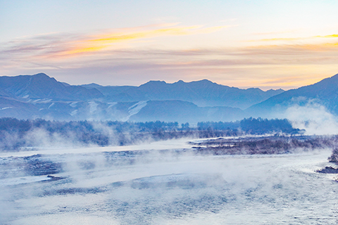 ◎ 十二月十一日清晨,地處祁連山腹地的青海省門源回族自治縣大通河河面上晨霧昇騰。(無人機照片)(中新社記者馬銘言 攝)