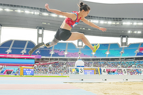 ◎ 十二月十四日,四川隊選手陳憶梅在女子跳遠T63級決賽試跳後整理假肢。最終,她獲得冠軍。全國第十二屆殘疾人運動會暨第九屆特殊奧林匹克運動會田徑項目在廣州落下帷幕。(新華社記者 劉夢琪 攝)