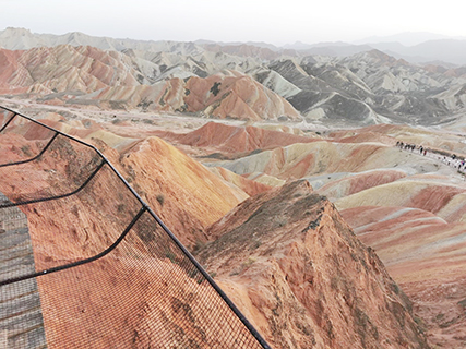 午餐後,團隊乘車前往張掖市,參觀世界十大神奇地理奇觀—張掖七彩丹霞地質公園。那裡雖然沒有藍天碧海、高原綠草的景致,但卻有世界上少有的水色胭脂的如畫般美景,也是現今國內唯一的丹霞地貌與彩色丘陵景觀高度複合區。它以氣勢磅礡、形態豐富、色彩斑斕而著稱,具有極高的觀賞和重要的科考價值,過去多部電影如《太陽照常升起》《三槍拍案驚奇》和《神探狄仁傑(第三部)》等,均是在此區拍攝外景的。
