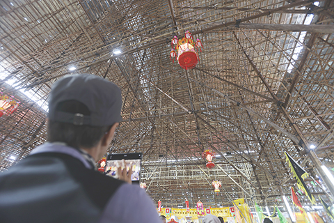 ◎ 十二月十八日,香港十年一屆的傳統活動「錦田鄉酬恩建醮」吸引大批市民和遊客去參觀。「錦田鄉酬恩建醮」由十三日起至十九日一連七天舉辦,是香港歷史最悠久的太平清醮之一,活動主要內容為搭建大型竹棚進行祭祀及祈福儀式。由竹枝紮作而成的巨型醮棚,獲《健力士世界紀錄》認證為全球最大臨時竹構祭壇。圖為香港錦田鄉酬恩建醮竹棚。(香港中通社記者鄧梓傑 攝)