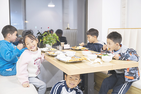 ◎ 十一月廿五日,放學的小朋友在春明北社區食堂內用餐。(新華社記者伍志尊 攝)