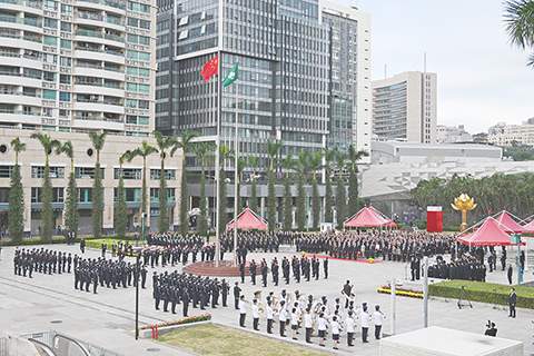 招待酒會前,特區政府早上八時在金蓮花廣場舉行慶祝中華人民共和國澳門特別行政區成立廿六周年升旗儀式,行政長官、中央駐澳機構負責人、特區立法及司法機關負責人、政府主要官員、行政會委員、立法會議員及各界人士等約五百五十人出席。◇