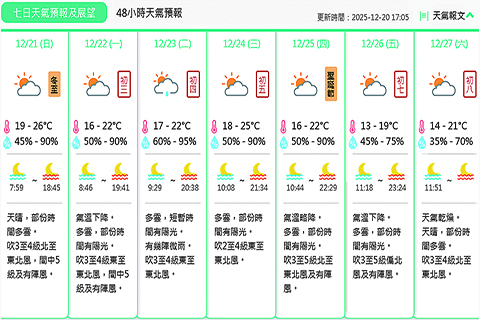 【特訊】地球物理氣象局消息:預料今日一股東北季風補充將抵達華南沿岸,本周初期氣溫下降,早晚天氣清涼。展望本周後期東北季風再度增強,氣溫再次下降,早晚天氣相當清涼,天氣乾燥。